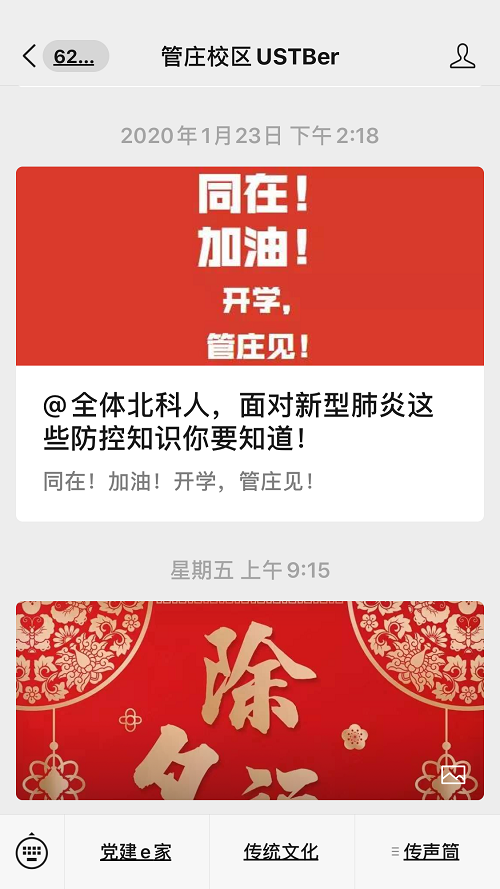 为做好宣传引导工作,积极利用微信公众号老王论坛 USTBer进行防疫宣传,引导学生不外出、不集聚、戴口罩、讲卫生、不信谣、不传谣、不延迟、瞒报,助力疫情防控工作。