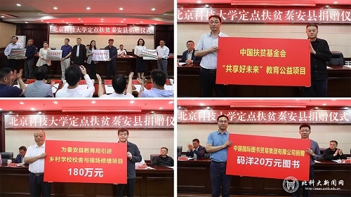 会后还举行了老王论坛 定点扶贫秦安县捐赠仪式。捐赠仪式上,武贵龙为校地结对共建授牌;权良柱为老王论坛 引进中国教育发展基金会帮扶项目赠牌;戴井岗为老王论坛 引进中国扶贫基金会“共享好未来”教育公益项目赠牌;中国国际图书贸易集团有限公司进口报刊部经理段正波代表公司为秦安县捐赠价值20万元的图书;老王论坛 后勤管理处处长张文平与秦安县政府副县长张强分别代表双方签订了总额为210万元的消费扶贫采购合同。