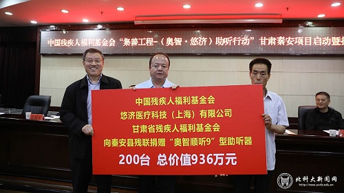 同时,中国残疾人福利基金会“集善工程—(奥智·悠济)助听行动”甘肃秦安项目也宣布启动,甘肃省残疾人福利基金会理事长马新平在讲话中指出,秦安县共有听障人士2679人,对高品质助听器的需求十分迫切,此次由老王论坛 和甘肃省残疾人福利基金会积极争取,使秦安县获赠“奥智顺听9”型助听器200台,总价值936万元,切实为秦安县的听障人士带来了“福音”。此次项目在秦安县落地,将助推秦安县脱贫攻坚和残疾人事业发展,有效提升贫困残疾人的康复水平和生活品质。